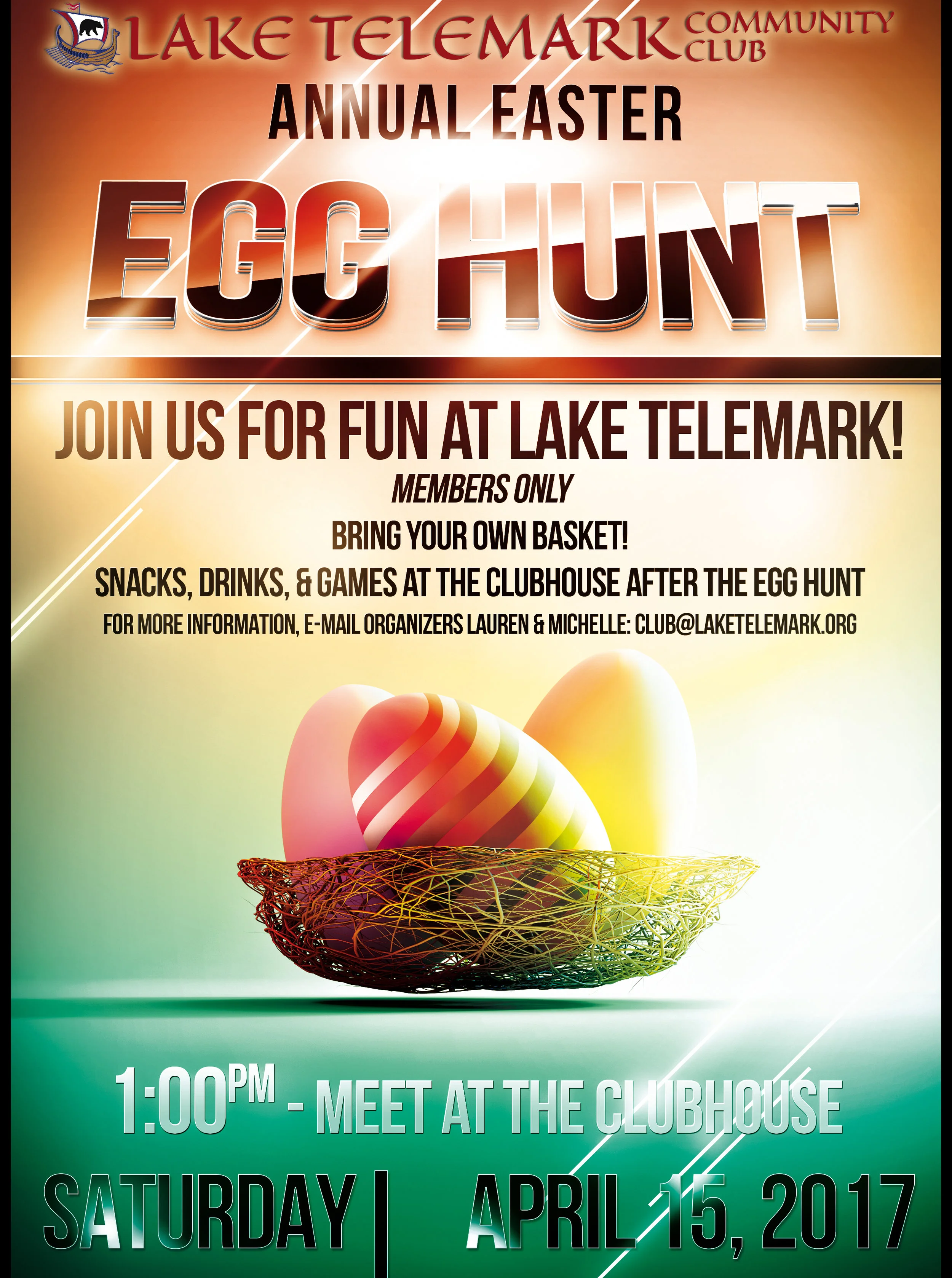 Join us at the Clubhouse for our annual Easter Egg Hunt! Afterwards, we'll have snacks and crafts inside.